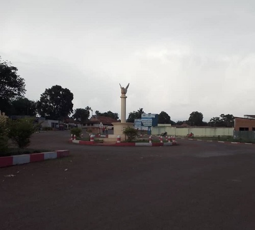 Bambari au crépuscule — Le rond-point central, couramment appelé le Rond-point de l’Espoir, se dresse silencieusement sous un ciel menaçant, symbolisant à la fois la tranquillité et l’agitation de la ville à la tombée de la nuit.. CopyrightCNC
