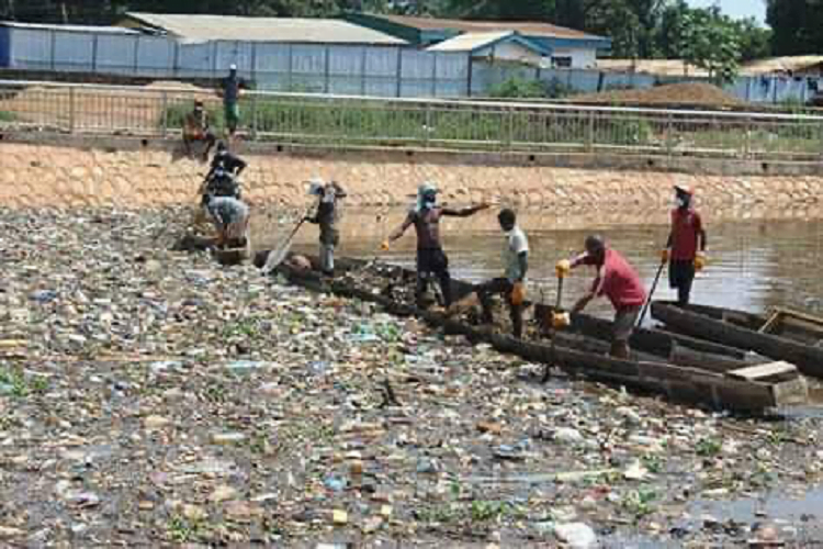 Des jeunes du secteur embarqués dans trois pirogues et équipés des tamis pour extraire les détritus, le président du Parti pour la Renaissance touché par leur courage a acheté des matériels pour appuyer cette œuvre citoyenne.