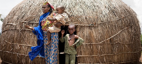 Une femme et ses fils se tiennent devant leur abri dans un camp des déplacé à Baboua, au nord-ouest de la République centrafricaine.