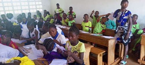 Des élèves assis dans une salle de classe à l’école primaire de Bessan, en République Centrafricaine, écoutant attentivement leur enseignant.