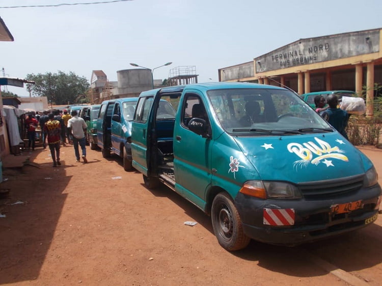 Des minibus stationnés au terminus nord au centre-ville de Bangui. Photo CNC / Mickael Kossi