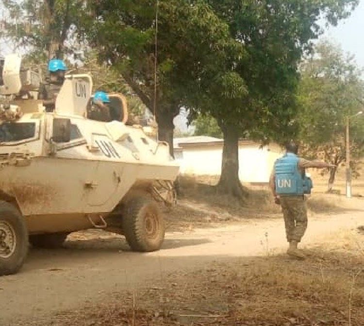 Un blindé des forces de la Minusca, en patrouille dans la ville de Ndélé, le 13 mars 2020. Photo CNC / Moïse Banafio.