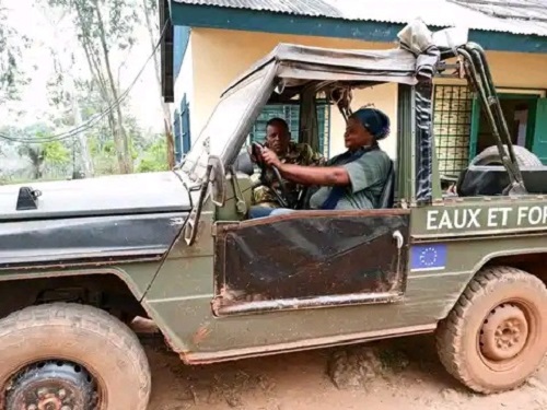 Deux agents des eaux et forêts discutant dans un véhicule tout-terrain boueux marqué de l’insigne de l’Union Européenne dans une zone forestière.
