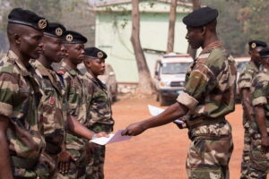 Les soldats de l’armée nationale (FACA) devant le camp militaire de Kassaï après une marche commando