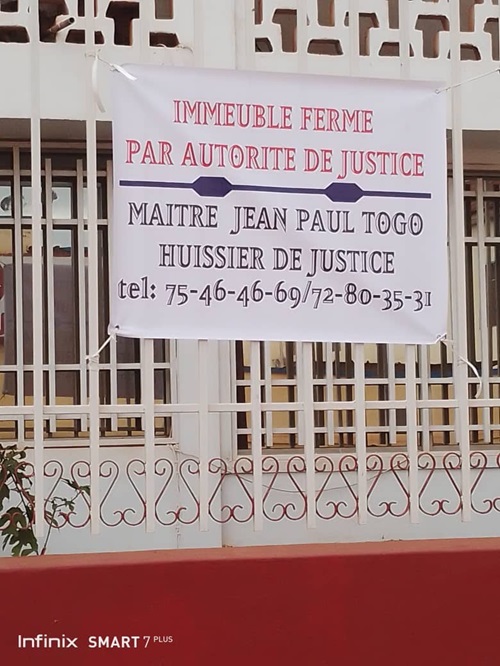 “Bannière annonçant la fermeture judiciaire d’un immeuble par Maître Jean Paul Togo, affichée sur une façade à fenêtres grillagées.” Description