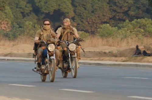 Deux mercenaires Syriens de la société Wagner sur les motos réquisitionnées en route pour Béloko