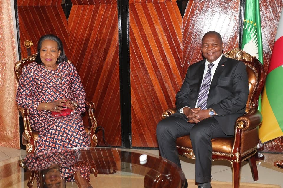 l'ex-chef d'État de transition catherine samba-panza et le chef de l'État faustin archange touadera au palais de la renaissance le 17 janvier 2020